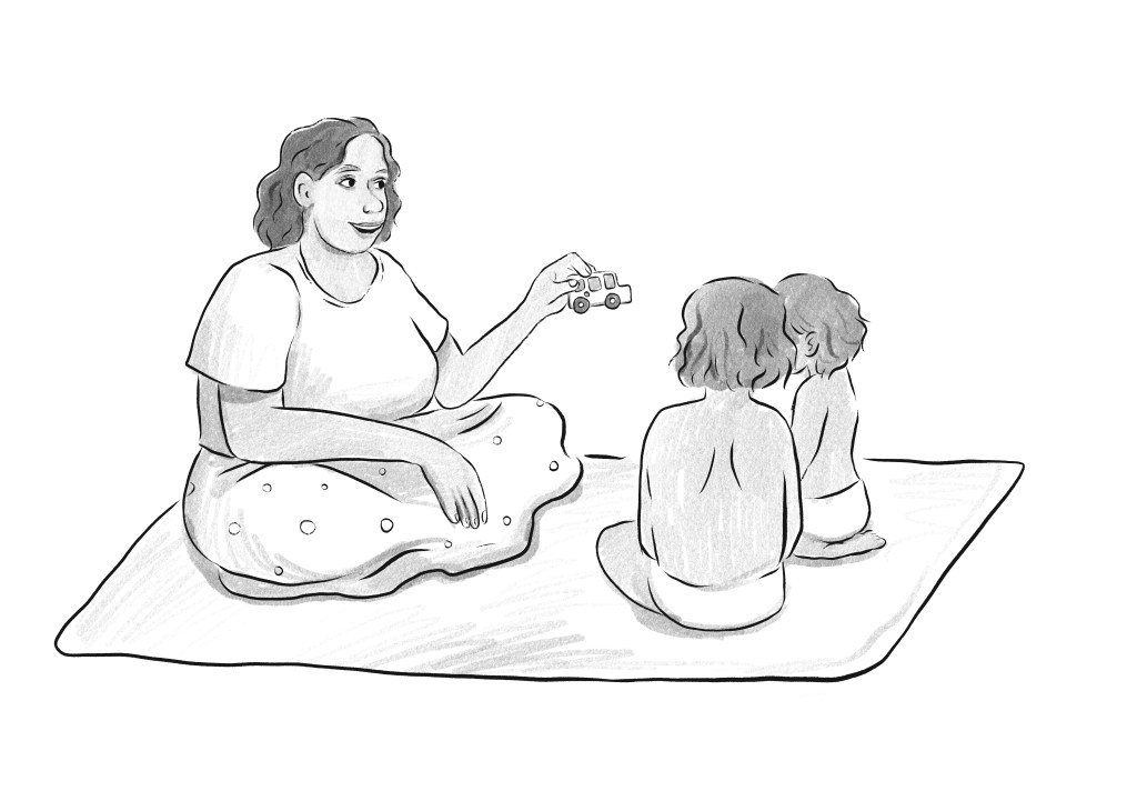 Adults talk to children about what is going on around them. They use an up-and down voice style (part of Baby Talk or child-directed speech), change their voices to make them interesting and use hand signs and gestures to make talking interesting for the children. This helps to promote children’s language learning by helping them to have positive experiences when communicating.
