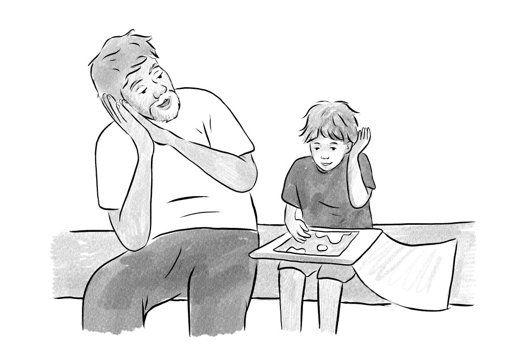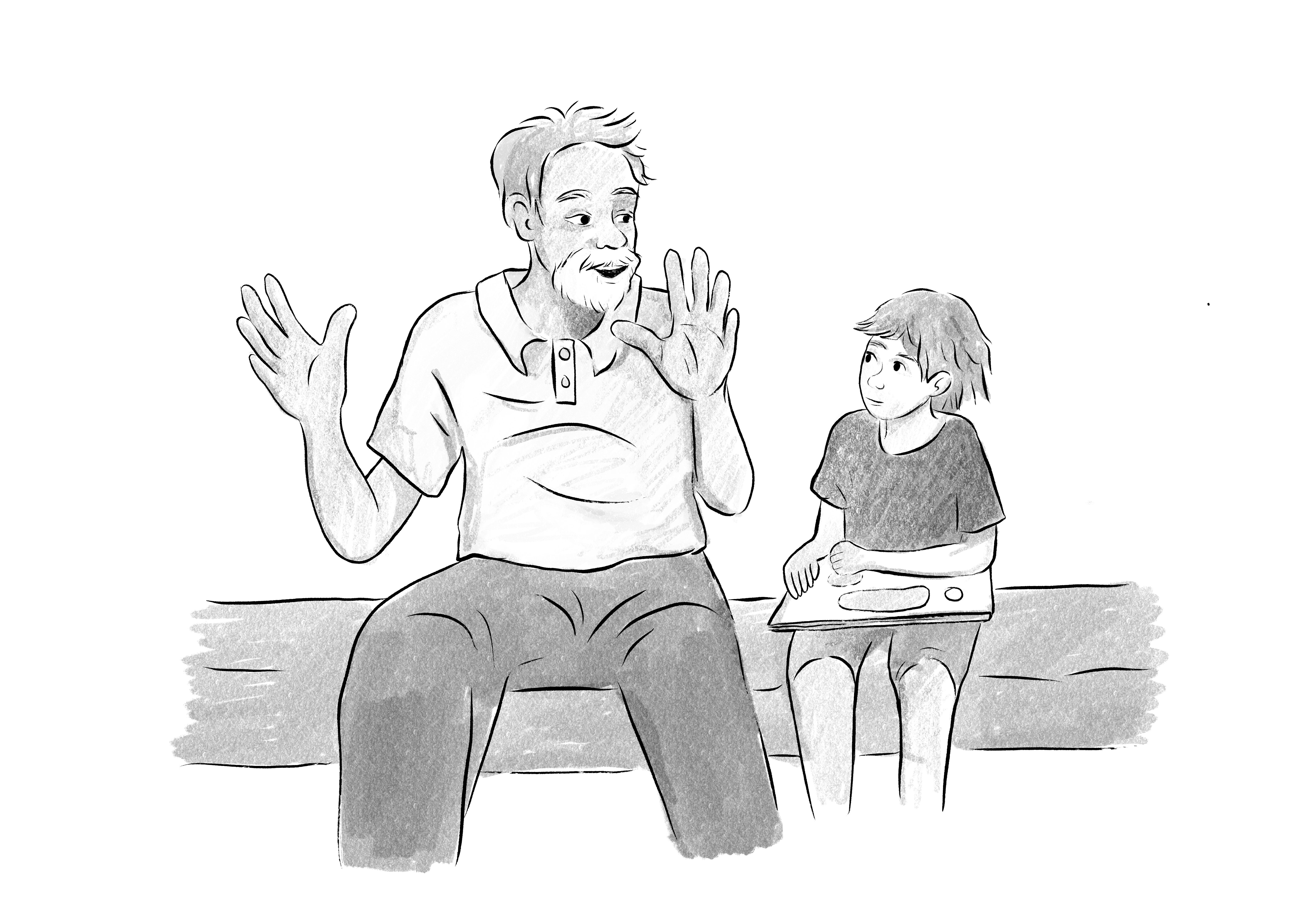 By modelling this type of action and speech, the grandfather helps the child to connect emotionally with the characters in the picture book.