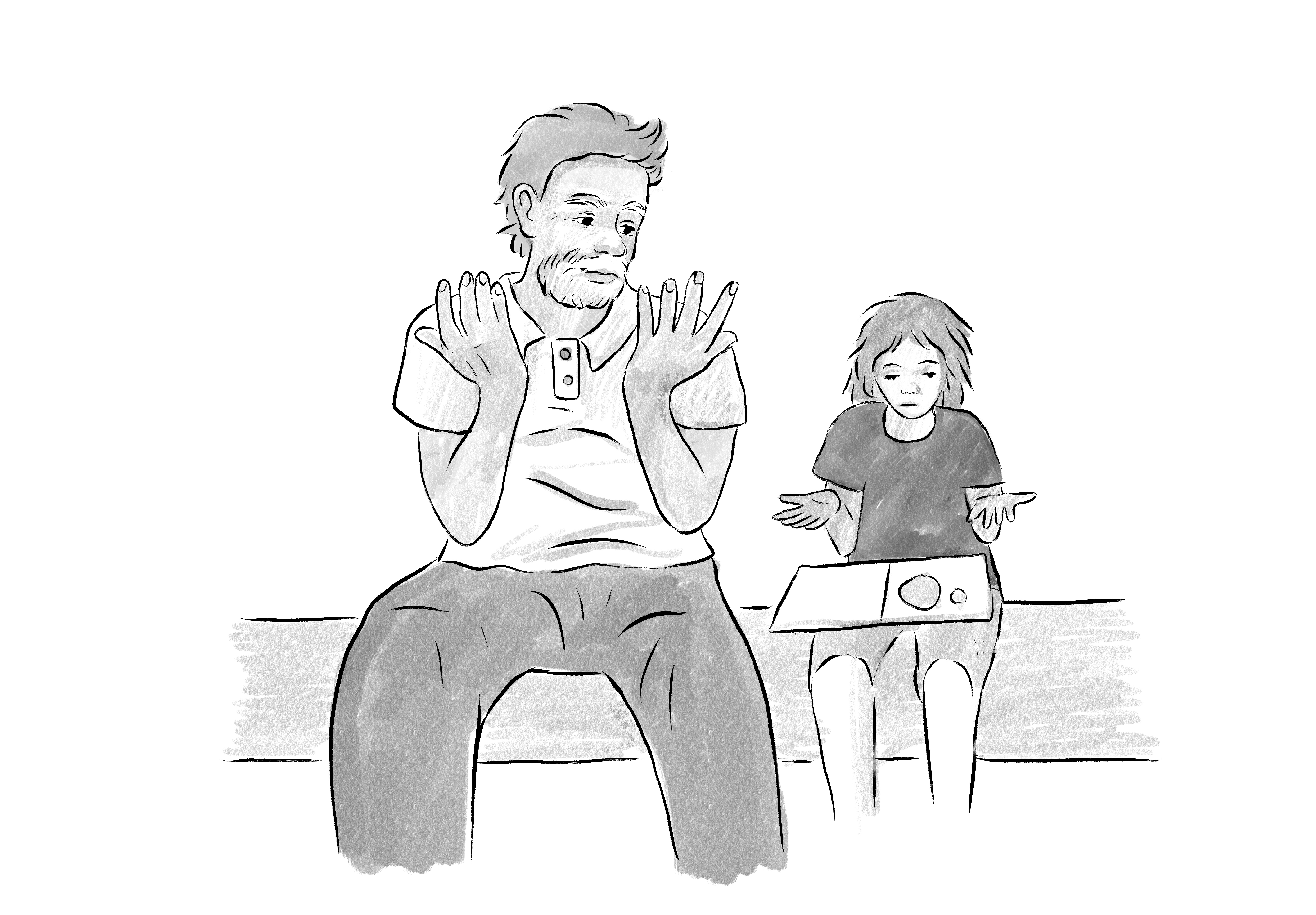 6. A grandfather shows his granddaughter which hand action to do and to say in Warlpiri “yakarra!” ‘oh no!’.